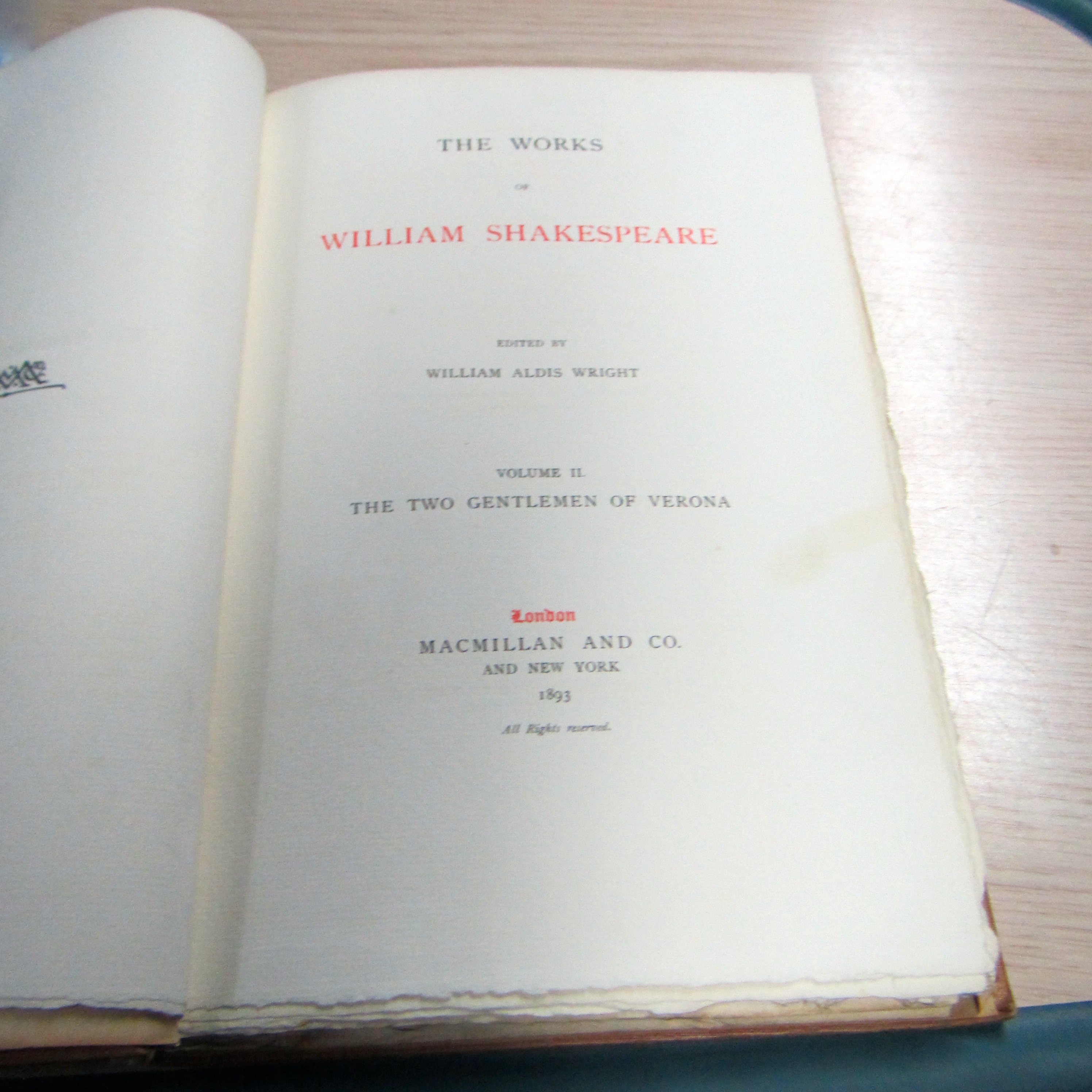 After reading The Tempest in the RSC’s modern edition of the First Folio, I decided to do something different with Two Gentlemen of Verona and read it in the oldest edition Cardiff University Library still kept on loan. After a few minutes browsing the dustiest and least regarded avenues of Shakespeare Criticism, I found myself holding a 122 year-old edition published in 1893 as part of the original Cambridge Shakespeare series. A tall book printed on handmade paper with generous margins, it was clearly something of a prestige object, and the bookplates in the endpapers revealed a long working life. Originally part of the City of Cardiff Libraries Collection, it was withdrawn as duplicate stock and presented to the University College of South Wales and Monmouthshire, as it was then, in 1939. Now broken in the spine and largely held together by sticky tape, it still proves a pleasure to read – th