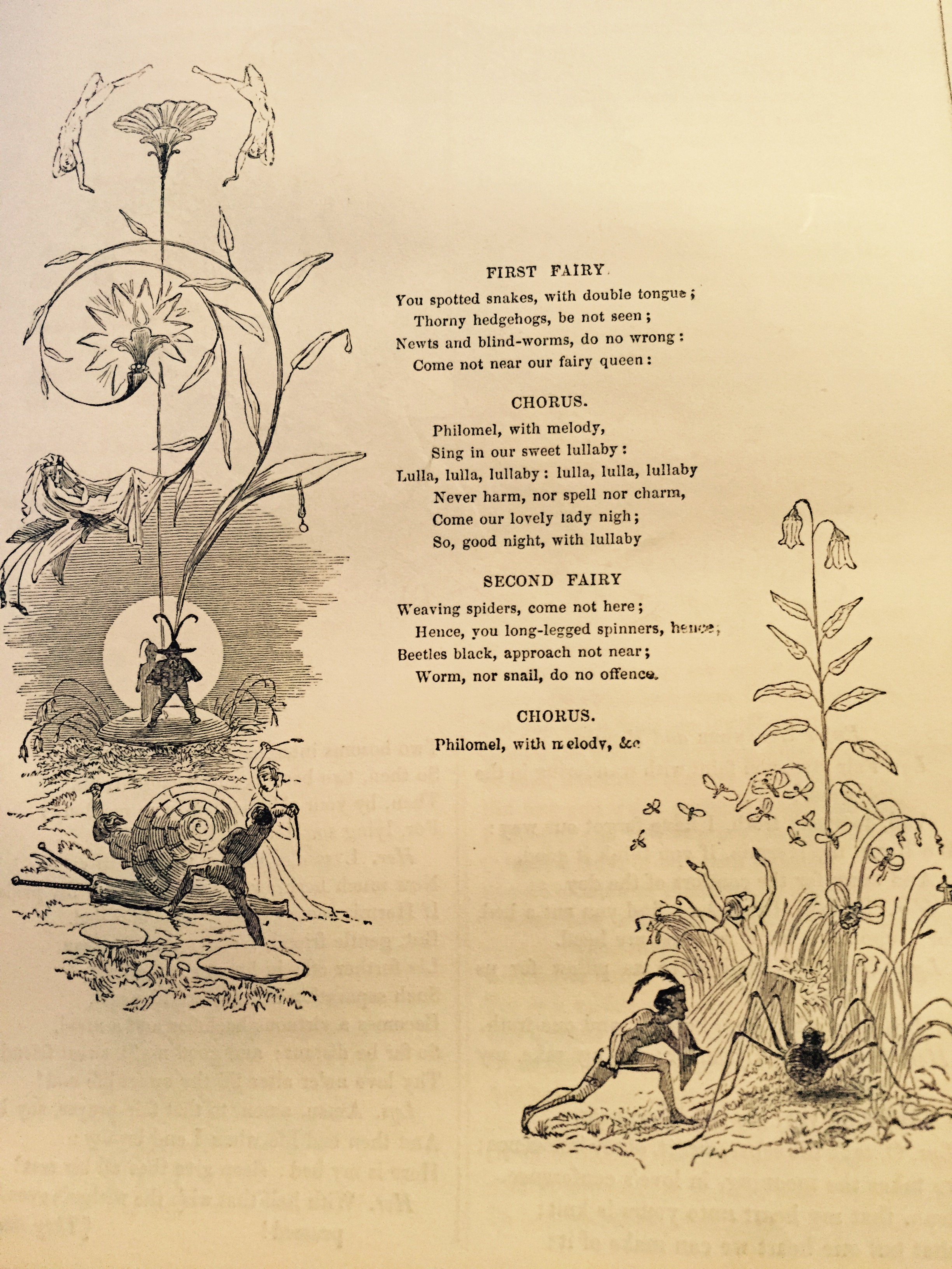 c would be laughed out of his job for writing this, but everyone can admire the sentiment. The small print, two column format allow Meadows’s sketches to sit close to the actions they illustrate – sometimes, as with some of the fairy songs, the two seem almost to interact. It’s an organic way of illustration and one he seems much more comfortable with than the more standard dedication of a large illustration to a single page, to judge by the rather stiff and ungainly frontispiece to the play.