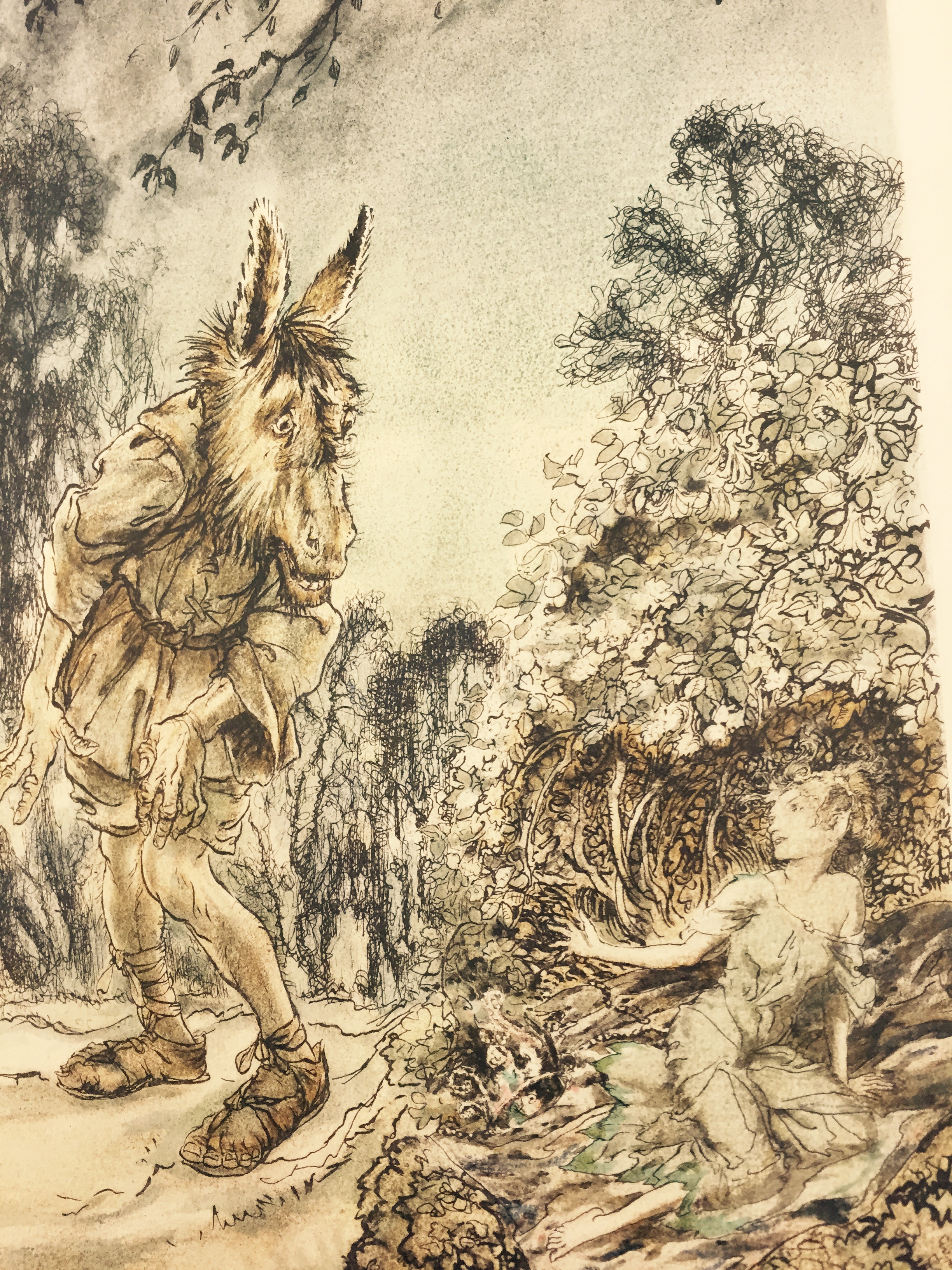 For these reasons, I was keen to get hold of an illustrated edition for my blog. Cardiff University Library hold one of the most beautiful examples ever printed, but to my disappointment I’d already covered that edition in my reading of The Comedy of Errors. I was sorely tempted to break my own rule of reading each play in a different edition, but eventually decided to move on – but not without giving you a view of Arthur Rackham’s incomparable Bottom. (No, sorry, that didn’t come out right.)