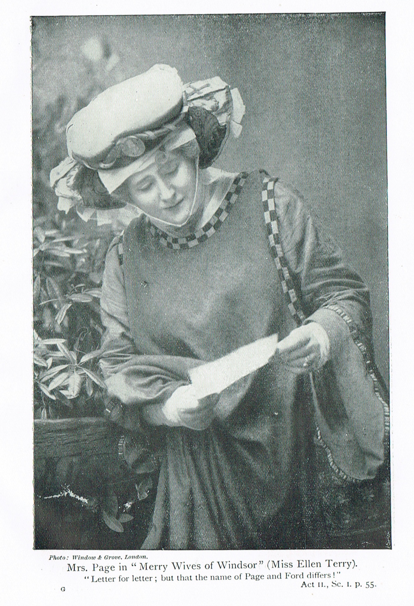 Among the other treasures in the old book are a scattering of early photographs of Shakespearean actors and actresses. The Merry Wives of Windsor is represented by a studio portrait of Ellen Terry as Mistress Ford; Terry was one of the most famous actresses of her day, now sadly only known for having been Dickens’s mistress. In a delightful period feature, a collection of tabs recessed into the sides of the pages make it easier to flick from play to play.
